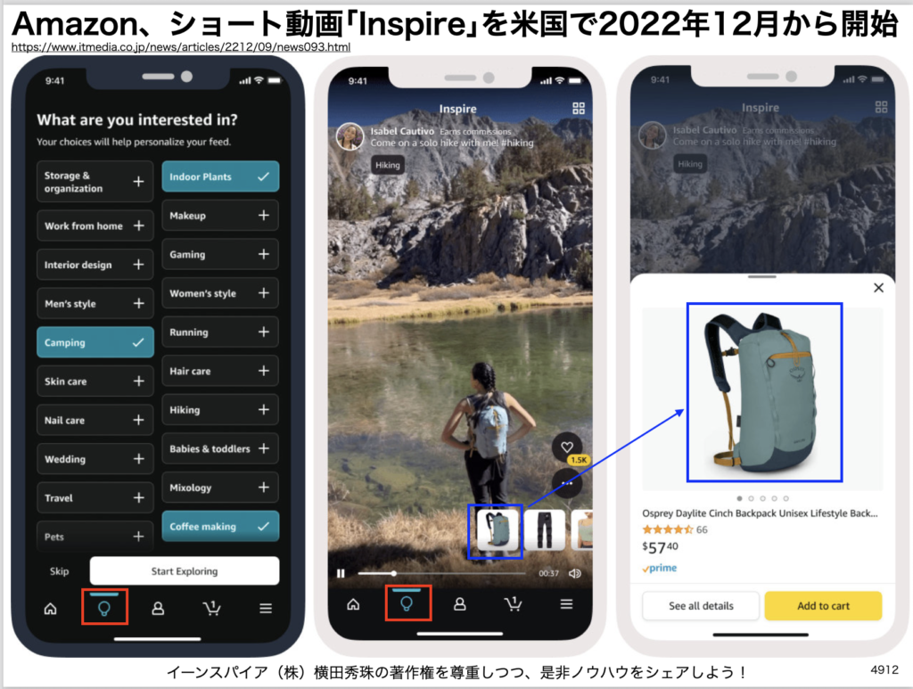2023年7月8日に私が書いた記事なんですが、Amazonが今何を目指しているかという中で、「Inspire(インスパイア)」というショート動画をタブとして追加しまして、そこの中で新しく発見してもらうような仕組みを作ったということについて速報でお伝えしました。これがまだ日本に入ってきていないけど、入ってくるんじゃないかということについて、私は予言をしていたわけです。