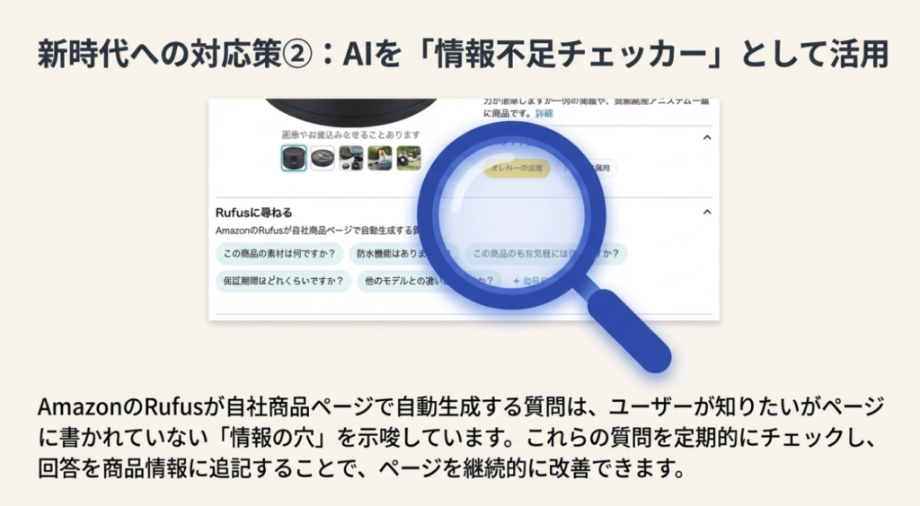 | 比較・検討の作業 | ユーザー自身が複数タブで商品を比較する必要がある | AIがスペックやレビューを要約・比較し、長所短所を説明 |
