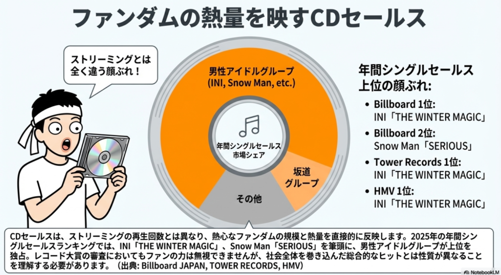デジタル配信が主流となった現在でも、CDセールスはアーティストの熱心なファン層、すなわち「コアファンダム」の規模とエンゲージメントを測る上で重要な指標であり続けています。CDセールスチャートが「コアファンダム」の熱心な購買力を反映する領域であるのに対し、デジタルやカラオケのチャートはより広範な「大衆のエンゲージメント」や「社会的浸透度」を測定します。年間を代表する楽曲の称号は、これら全ての領域を制覇できる楽曲にこそ与えられるべきです。