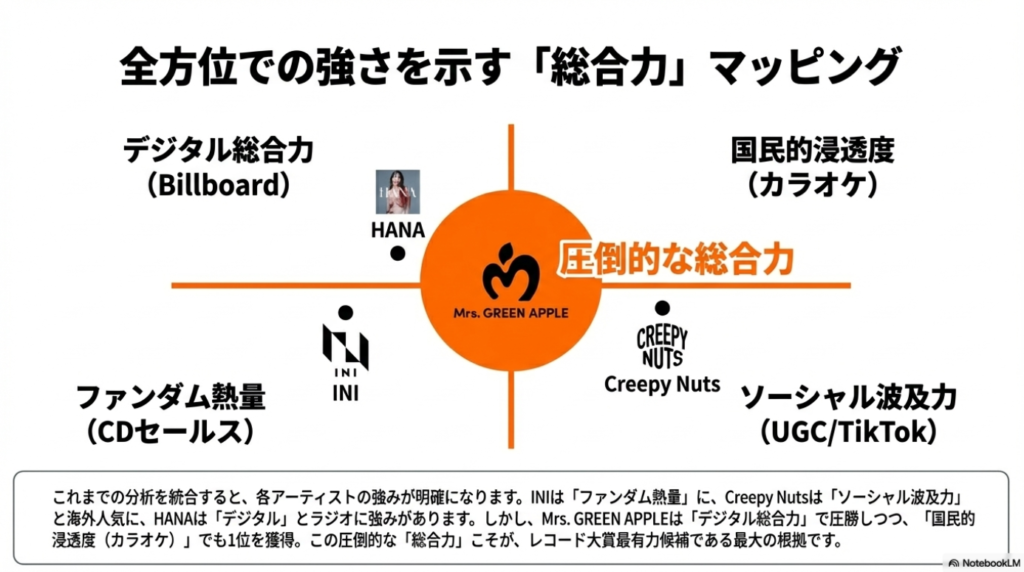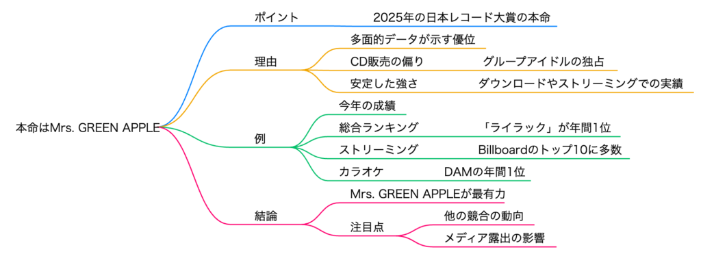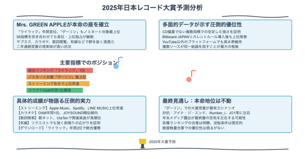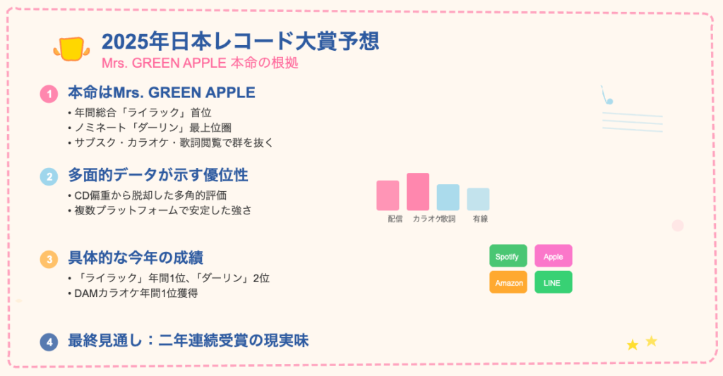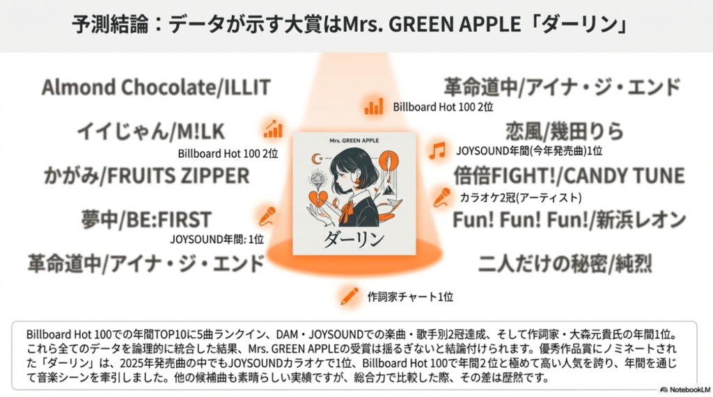 これまでの分析を総括すると、**Mrs. GREEN APPLEの「ダーリン」**が第67回日本レコード大賞の最有力候補であることは論理的な帰結と言えます。その理由は、単一の指標における成功に留まらず、複数の主要な評価軸において圧倒的な結果を残している点にあります。