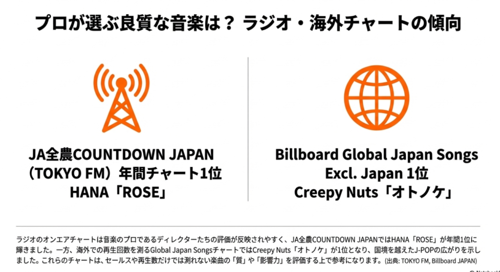 これらの優れた楽曲の中から、2025年を最も象徴する一曲はどれになるのか。本レポートでは、各楽曲が年間を通じて記録したパフォーマンスを客観的データで評価し、最終的な予測を導き出すプロセスを詳細に解説します。