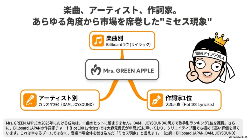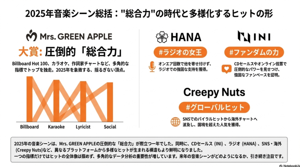 本レポートでは、各種音楽チャートの年間データを多角的に分析し、第67回日本レコード大賞の行方を予測しました。分析の結果、2025年の音楽シーンは、楽曲人気、アーティスト人気、そしてクリエイターとしての評価のいずれにおいても、Mrs. GREEN APPLEが席巻した一年であったことが明らかになりました。