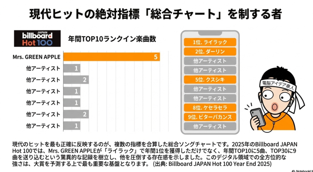 一方で、Mrs. GREEN APPLEはデジタル配信を主戦場としており、シングルCDのセールスチャートでは上位に食い込んでいません。この事実は、各指標が異なる成功の形を映し出すことを示唆しています。大賞の行方を占う上で、特定の指標での強さだけでなく、全ての指標を横断した総合的なパフォーマンスバランスがいかに重要であるかが浮き彫りになります。
