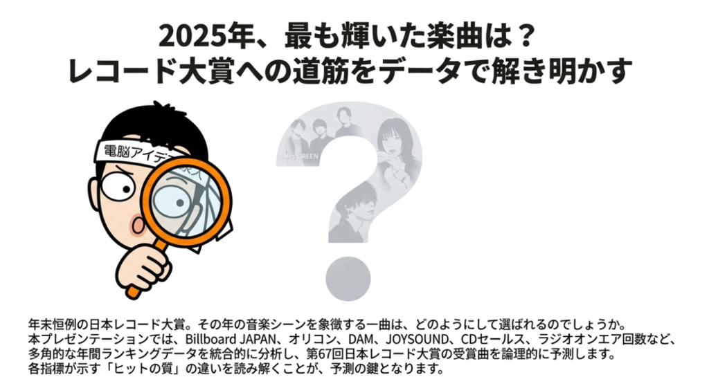 2025年の日本の音楽シーンを彩った楽曲の動向を多角的に分析し、そのデータに基づいて第67回日本レコード大賞の最高栄誉である「大賞」の受賞作品を予測することを目的としています。分析にあたっては、デジタル配信、ストリーミング、CDセールス、カラオケランキング、ラジオオンエアといった主要な音楽チャートを横断的に評価し、客観的な指標に基づいた結論を導き出します。