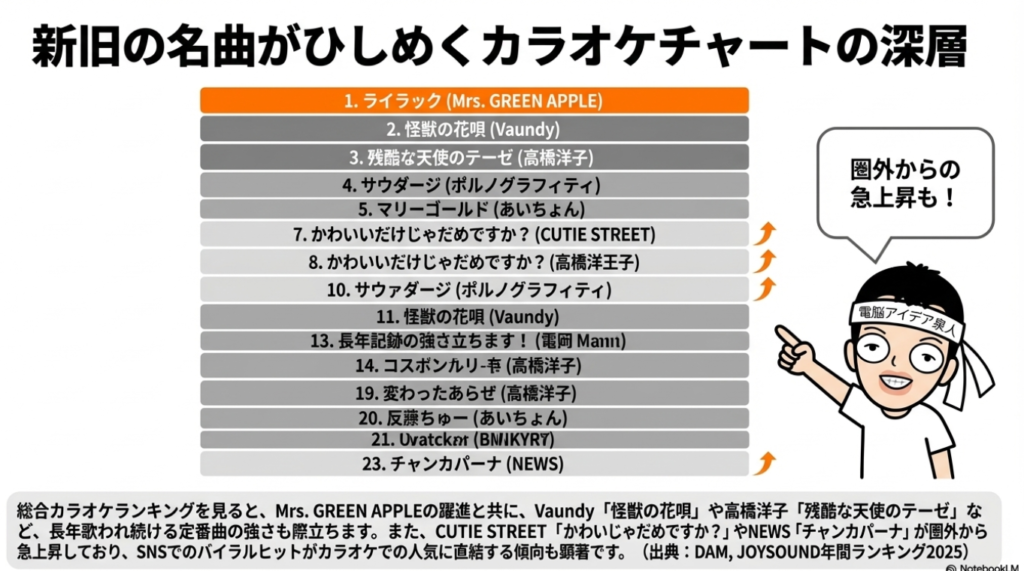 しかし、より注目すべきは、新旧すべての楽曲を含む「総合年間ランキング」の動向です。この総合チャートにおいて、**「ダーリン」はDAMで9位、JOYSOUNDで16位とトップ20入りを果たしつつ、両チャートの総合1位には同アーティストの「ライラック」**が輝いています。一つのアーティストが、その年にリリースした新曲と既存のヒット曲の両方で年間チャートの最上位を占拠するというこの現象は、前代未聞の市場浸透度を示しており、「ダーリン」のヒットがアーティスト全体の圧倒的な勢いに支えられていることを物語っています。