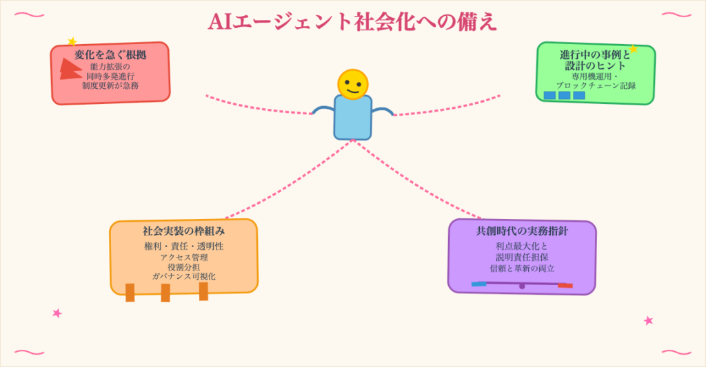 🌐 ガバナンス AIや組織の行動を規律・管理するための仕組みやルールのことです。AIエージェントが自律的に活動する社会では、誰が責任を持つか、どう透明性を確保するかが課題となります。技術だけでなく、社会全体での対話と制度設計が不可欠とされています。
