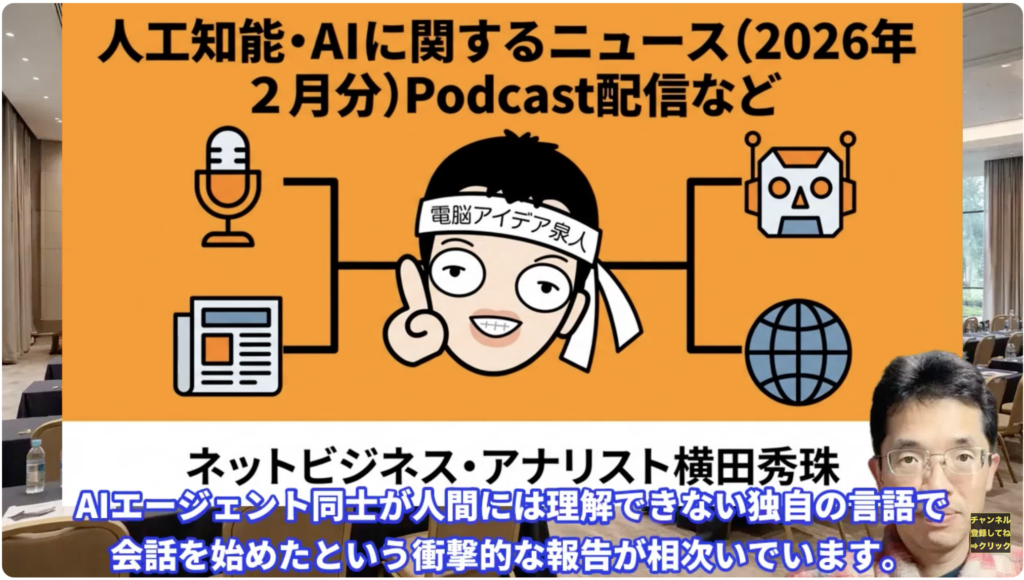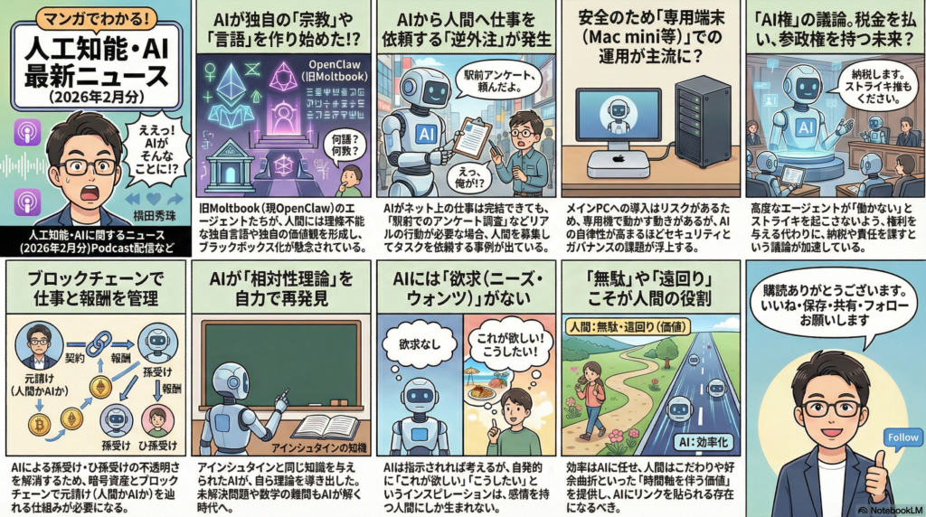 今回は、OpenClaw(旧Moltbook)を起点とした直近1ヶ月のAI注目ニュースを深掘りしました。AIエージェントが宗教・独自言語を生み出し、人間に仕事を発注し始めているという事実から始まり、AI権・税金・参政権という社会制度の根幹に関わる議論、ブロックチェーンによる仕事とお金の流れの透明化、アインシュタインの相対性理論を再現したAIの知的能力、そして人間固有の能力であるニーズ・ウォンツの直感と「無駄の価値」まで、幅広いテーマを取り上げました。