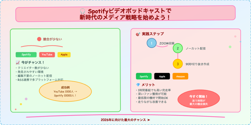 SpotifyやApple Podcastsなどでビデオポッドキャストへの注目が急拡大している。YouTubeが映像の奪い合いで激戦化する中、「耳」を使うビデオポッドキャストはまだブルーオーシャン。編集ほぼ不要でZOOM収録のみで始められ、1つの配信が複数プラットフォームに同時配信できる。さらにショート動画機能が追加され、新規発見の導線も整いつつある。筆者も「AI音楽ラジオ」番組を開始した。