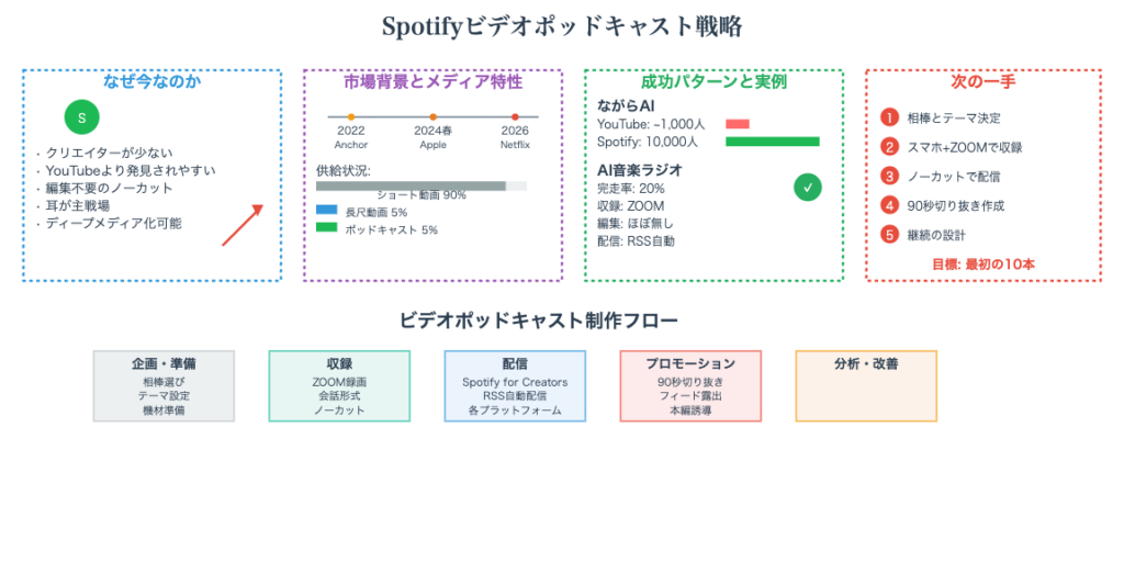 🎬 NetflixとSpotifyの提携 2026年よりNetflixとSpotifyが連携し、Spotify上のビデオポッドキャスト番組をNetflixでも視聴できるようになる取り組み。世界最大級の動画配信サービスとの連携により、Spotifyのビデオポッドキャストコンテンツの露出が大幅に拡大。この提携がビデオポッドキャスト市場の急成長に火をつけた。