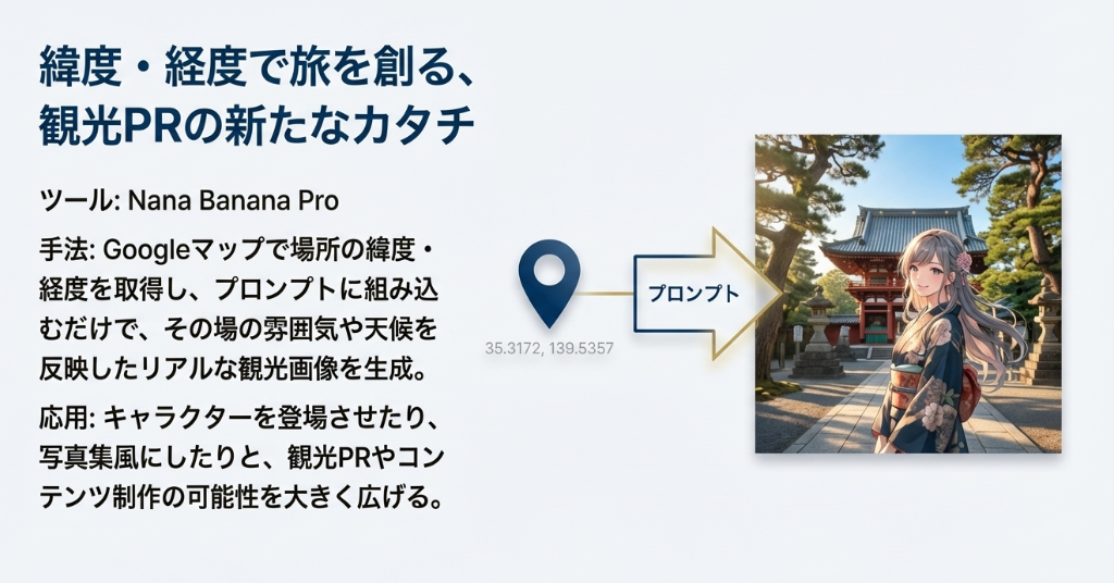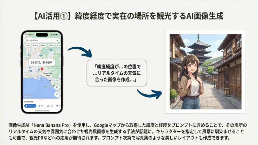• プロンプト技術が変えるマーケティング 画像生成AI「Nana Banana Pro」では、Googleマップから取得した緯度と経度を指定するだけで、その場所のリアルな画像を生成する手法が注目を集めています。これにより、キャラクターが鎌倉を旅行しているかのようなPR画像を瞬時に作成できるようになりました。これは、観光PRやコンテンツマーケティングのあり方を根本的に変え、コストと時間をかけずに高品質なビジュアルコンテンツを量産できる時代の到来を告げています。 また、自然な画像を生成するための「軽音部プロンプト」のようなノウハウがX(旧Twitter)で話題になっていることからも、プロンプト技術がクリエイティブの質を左右する新たな専門スキルセットとして確立されつつあることがわかります。