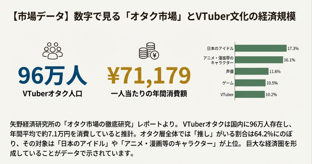 VTuber市場の成長は、情熱が経済を生み出す好例です。この情熱が持つ経済規模は計り知れません。矢野経済研究所の調査によれば、国内の「VTuberオタク」人口は96万人に達し、一人当たりの年間平均消費額は7万円を超えると推計されています。このデータは、同研究所がアニメからアイドル文化まで31の分野にわたって分析する、より広範な「オタク」市場調査の一部であり、その中でもVTuber市場が特に消費額の大きい重要なセグメントであることを示しています。