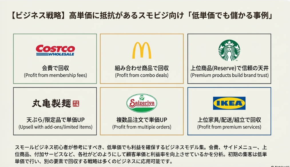 💰 低単価ビジネスモデル コストコの会費制、マックの組み合わせ商品、スタバのReserve上位店舗、丸亀製麺の天ぷら追加など、低単価商品でも利益を確保する30の事例が紹介されています。初期の低価格で顧客を獲得し、上位商品や追加サービス、会員制度などで収益を回収する戦略で、高単価に抵抗がある初心者向けのビジネスモデルです。