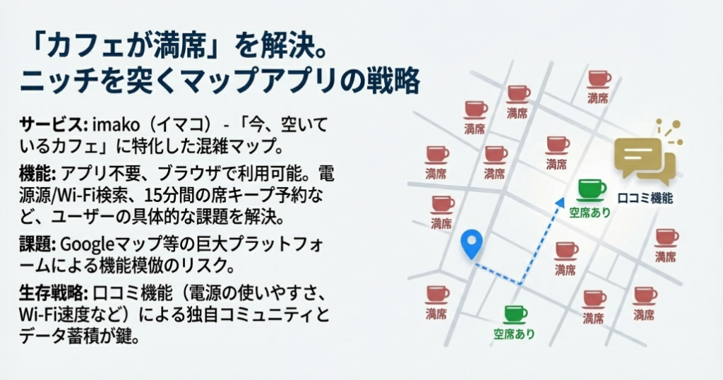 カフェ混雑マップ(imako) 東京エリアの約4,000店舗を対象に、現在空いているカフェをマップ表示するサービスです。アプリ不要でブラウザから無料利用でき、電源やWi-Fiの有無を検索可能で、15分間の席キープ予約機能も搭載しています。口コミ機能を充実させることでGoogleマップとの差別化を図り、生き残りを目指しています。