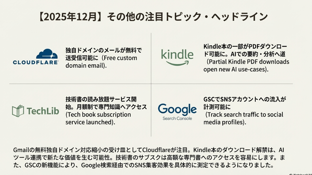 2025年12月に観測された個別のニュース、ツール、サービスは、一見すると無関係な事象の集合に見えるかもしれません。しかし、これらは単なる断片的な出来事ではなく、より大きな社会・経済的変化を示す重要な兆候です。本レポートは、これらの事象を深く分析し、現代社会を貫く大きな潮流を明らかにすることを目的とします。
