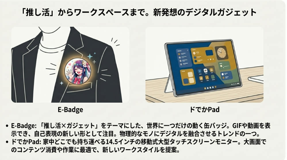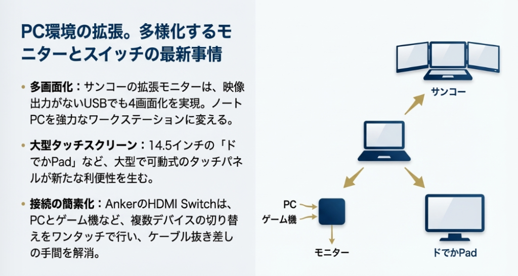 • ワークスペースの拡張: 移動式大画面モニター「ドでかPad」や、ノートPCを4画面化するサンコーの拡張モニターは、物理的なデスクスペースの制約を超え、どこでも生産性の高いワークスペースを構築したいというニーズに応えるものです。これにより、場所を選ばずに最大のパフォーマンスを発揮できる環境が整いつつあります。