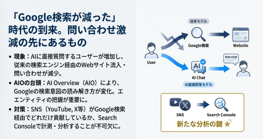 🔍 Google検索とAI検索の変化 Google検索が減少しAIに質問する人が増加したことで、企業への問い合わせが大幅に減少する現象が起きています。検索意図の読み取り方自体が変わり、AIO(AI Overviews)の導入により検索エンジン最適化の手法も変革期を迎えています。従来のSEO戦略の見直しが必要な時代になっています。