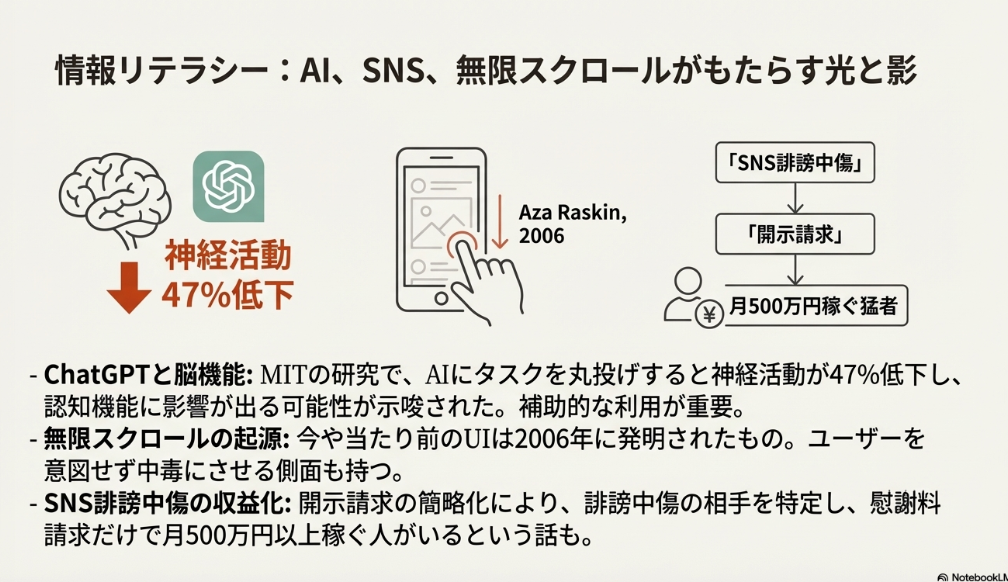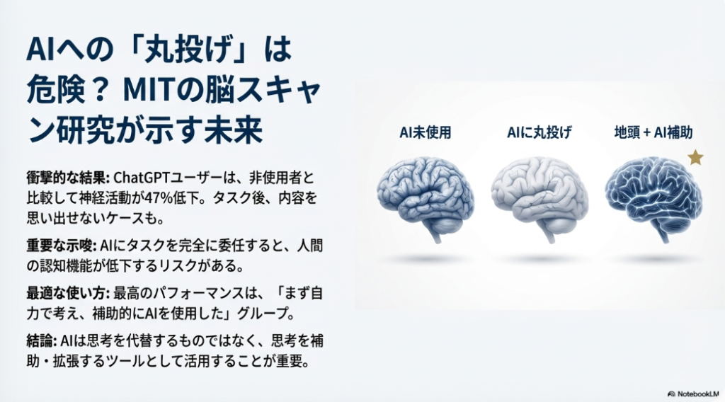 • 認知機能への警鐘 マサチューセッツ工科大学(MIT)が実施したChatGPTユーザーの脳スキャン研究は、さらに衝撃的な事実を明らかにしました。AIにタスクを完全に丸投げすると、神経活動が47%も低下し、認知機能が著しく損なわれる可能性が示されたのです。この研究は、「地頭を使いながら、補助的にAIを使うことが重要」であると結論付けており、AIとの健全な共存方法の模索が、教育やビジネスの現場における喫緊の課題となっています。