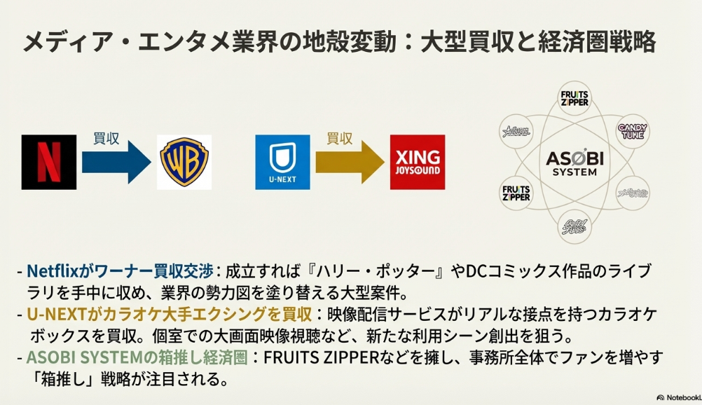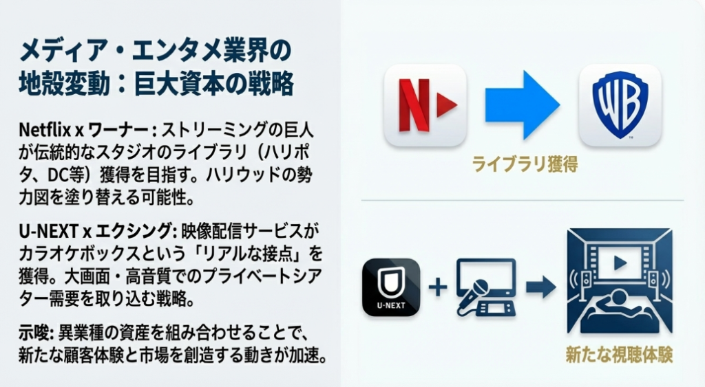 🎤 U-NEXT×エクシング買収 映像配信サービスU-NEXTが175億円でカラオケ大手エクシングを買収した事例です。カラオケボックスという全国のリアルな接点を大量に持つことで、自宅に大型スクリーンを購入せずとも映画などのコンテンツを大画面で楽しめる新たな視聴体験を提供する戦略で、利用頻度とコストのバランスを考えた隙間市場を狙っています。