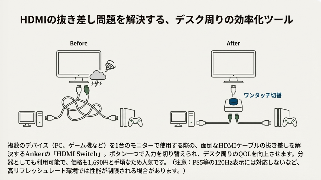 • Anker HDMI Switch: 在宅ワークで仕事用PCとプライベートのゲーム機を1台のモニターで使い分ける際のHDMIケーブルの抜き差しは、地味ながら大きなストレスでした。このシンプルなデバイスは、現代のハイブリッドな労働環境における「コンテキストスイッチの摩擦」という重要な一点を解消し、仕事とプライベートのモード移行を滑らかにし、精神的なエネルギーの消耗を防ぎます。