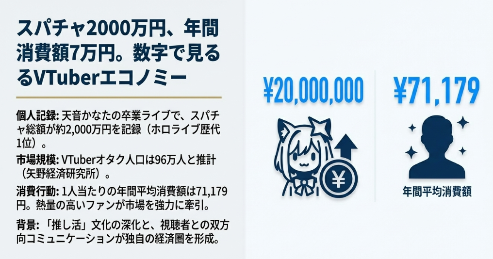 👾 VTuber市場 VTuberオタクは96万人で年間消費額は7万円超という市場規模に成長しています。天音かなたの卒業ライブでは約2,000万円のスパチャを記録し、ホロライブ・全VTuber歴代1位となりました。VTuber文化が定着し、エンターテインメント産業の重要な一翼を担う存在になっています。
