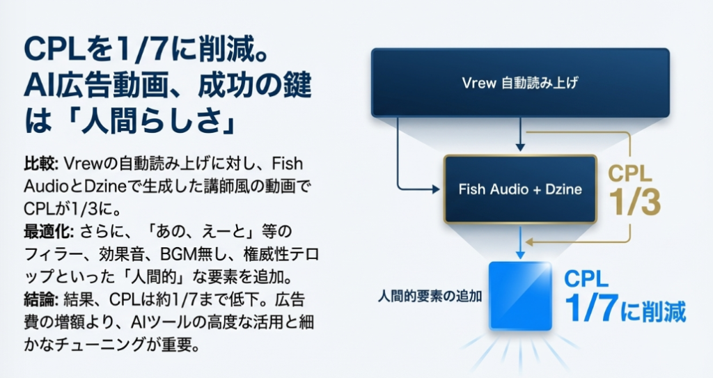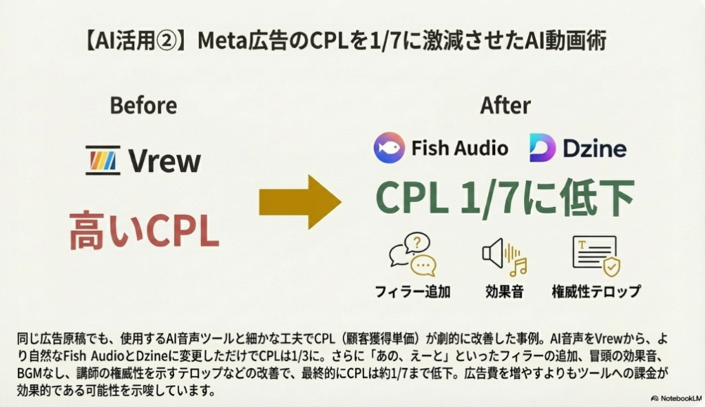 📊 CPL(Cost Per Lead) 1件の見込み客獲得にかかる広告費用を示すマーケティング指標です。Fish AudioとDzineを使ってAI動画を制作し、「あの、えーと」などのフィラーや効果音、BGMなしなどの工夫により、CPLを7分の1まで削減できた事例が紹介されており、広告費を増やすよりもツールへの投資が効果的であることが実証されています。