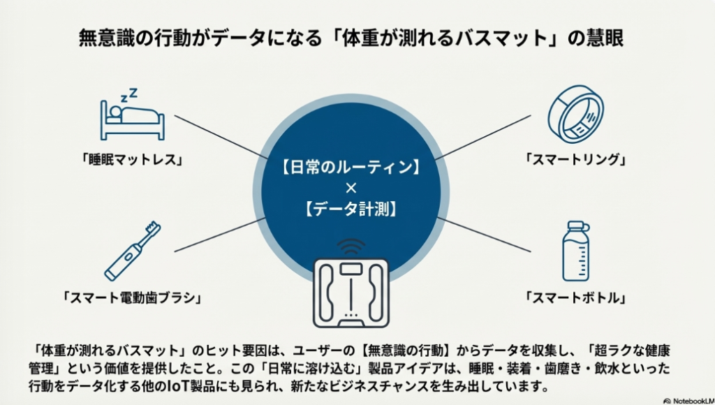 IoT(モノのインターネット)は新たなステージに突入し、私たちの日常のルーティンから無意識のうちにデータを収集・活用するモデルが成功を収めています。その象徴的な事例が「体重が測れるバスマット」です。これは、**「日常のルーティン × データ計測」**というコンセプトを見事に体現しています。このモデルは、様々な製品に応用され、個人の健康管理やライフスタイル改善に深く浸透し始めています。