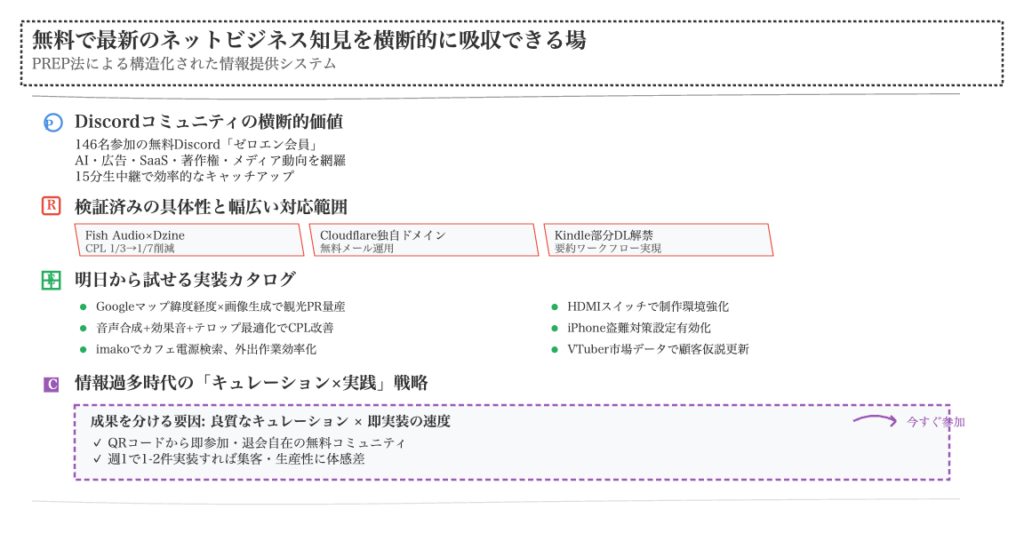 💬 ゼロエン会員(Discord) ネットビジネス研究会が運営する無料のDiscordコミュニティで、現在146名が参加しています。いつでも入退会可能で、最新のネットビジネス情報、ツール紹介、マーケティング事例、技術トレンドなどを共有しています。5段階の会員制度の中で最も安い無料コースとして、初心者でも気軽に情報収集できる環境を提供しています。