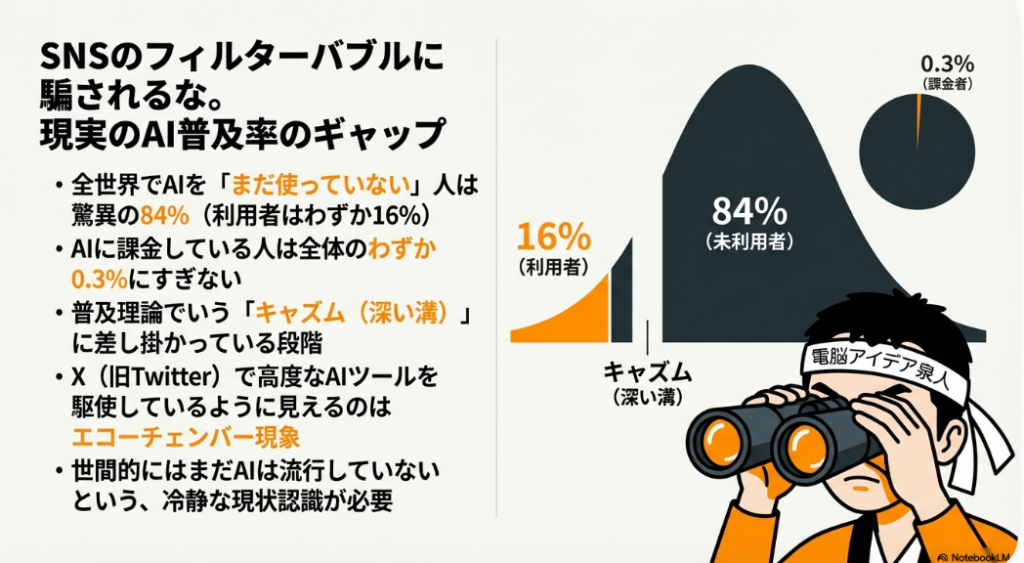 🧠 キャズム 新技術の普及曲線において、初期採用者層から一般大衆への普及に際して生じる「深い溝(断絶)」のこと。現在全世界でAIを使っていない人が84%というデータはまさにこの段階を示す。SNSで見えるAI活用の盛況はエコーチェンバーに過ぎず、一般普及はこれからが本番といえる。