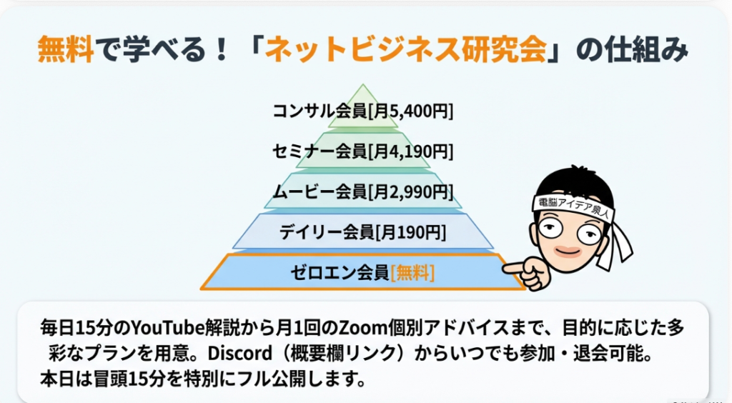 ネットビジネス研究会には、ゼロエン会員(無料)に続いて4段階の有料プランが用意されており、目的や学習スタイルに合わせて選択することができます。まず「デイリー会員(月額190円)」は、運営者が毎日解説する15分のYouTube解説動画が視聴できるプランです。月額190円という低コストで毎日のビジネス情報をインプットできるため、最もコストパフォーマンスに優れた入門プランと言えるでしょう。次に「ムービー会員(月額2,990円)」は、現在100本以上ストックされているセミナー教材の動画が見放題になるプランです。過去の動画資産を全て視聴できるため、体系的に学びたい人に向いています。「セミナー会員(月額4,190円)」では、月1回Zoomによるライブセミナーへのリアルタイム参加が可能になり、運営者や他の参加者と双方向でやり取りできるのが強みです。そして最上位の「コンサル会員(月額5,400円)」は、月1回30分の個別アドバイスをZoom経由で受けられるプランで、自分のビジネスの具体的な課題を直接相談できます。上位プランはすべて下位プランの特典を含むオールインワン構成なので、上に行くほどお得感が増す設計になっています。