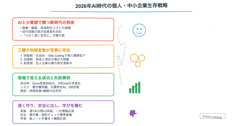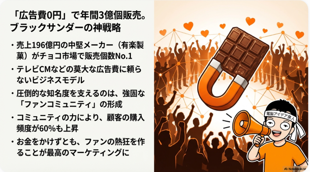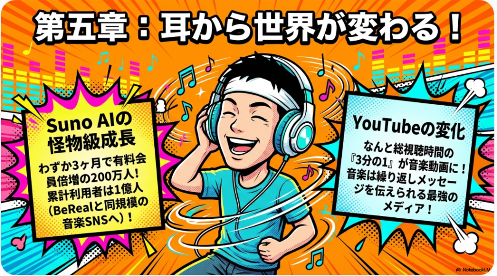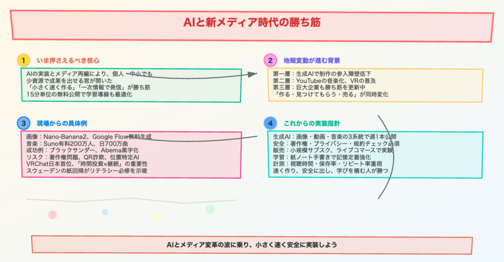 マーケティングの観点では、音楽生成AIのSunoが3ヶ月で有料会員を倍増させた事例や、ブラックサンダーの「広告費ゼロ・ファンコミュニティ戦略」は特に参考になります。また、「AIを使っている人はまだ16%」というデータが示すように、今こそ先行者として動くチャンスです。
