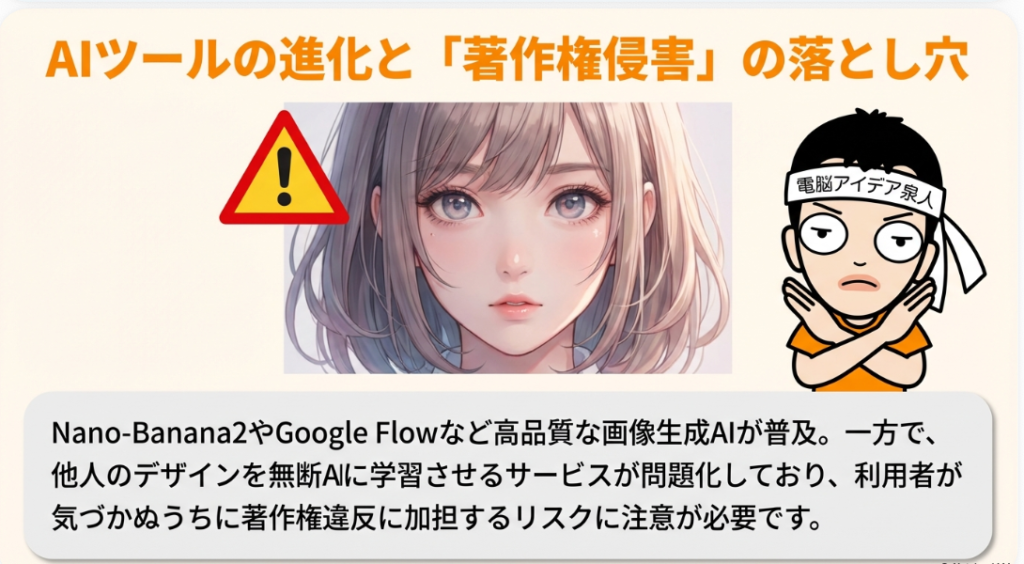 ⚖️ 著作権 創作物に対して作者が持つ権利。AIによるデザインテンプレートの無断学習・公開が問題となっており、他者の制作物をAI学習に流用する行為は著作権侵害につながる可能性がある。著作物とアイデアのまとめを見極める情報リテラシーが利用者に求められる。