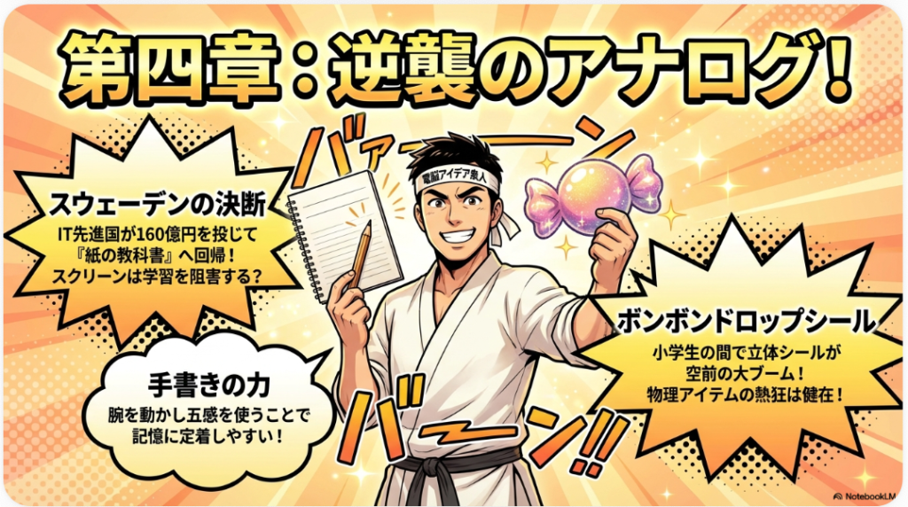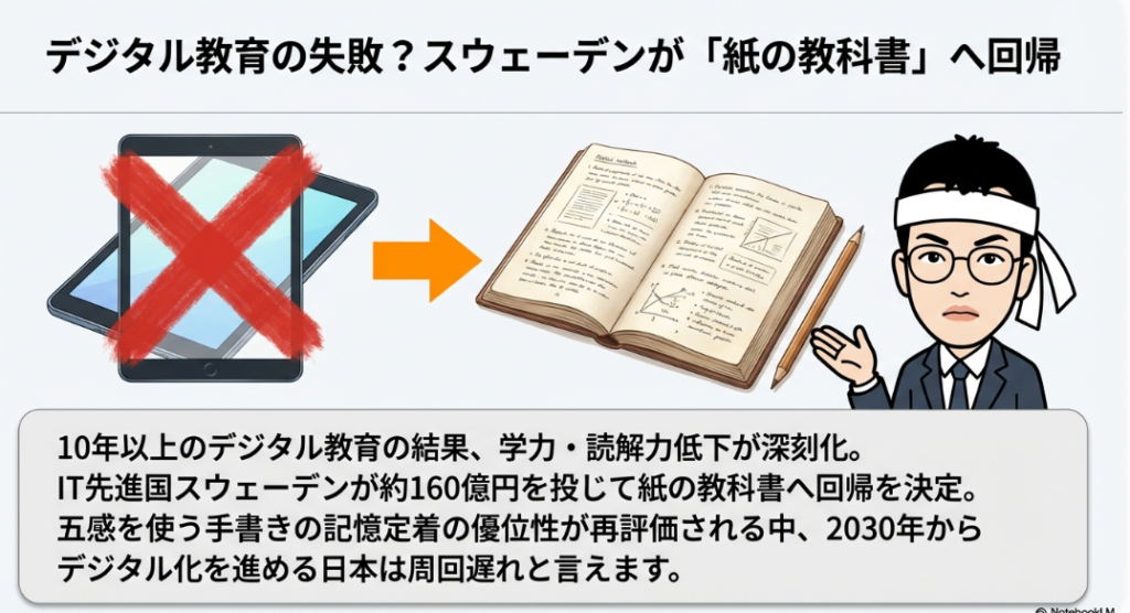 10年以上デジタル教育を実施した結果、学力低下と集中力の欠如が深刻化し、「スクリーンは学習を阻害する」という結論に達しました。世界がデジタルからアナログへ回帰する中、日本は2030年からデジタル教科書に踏み切るという、1周遅れの動きが話題になっています。