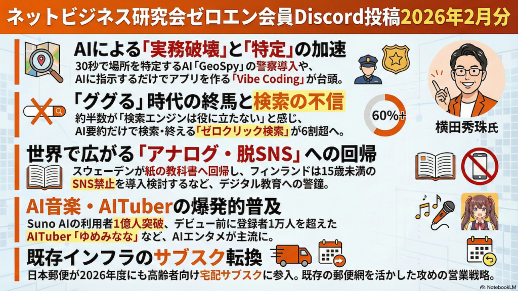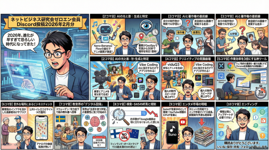 2026年2月のネットビジネス研究会Discord投稿まとめ。画像・動画生成AIの進化、AIによる撮影地特定や著作権問題など社会的リスクも拡大。Vibe Codingの台頭や音楽生成AI「Suno」の急成長など、AIが各産業を塗り替えつつある。一方、生成AI依存による思考力低下やデジタル教育の見直しなど、テクノロジーの功罪を考えさせるトレンドも目立った。