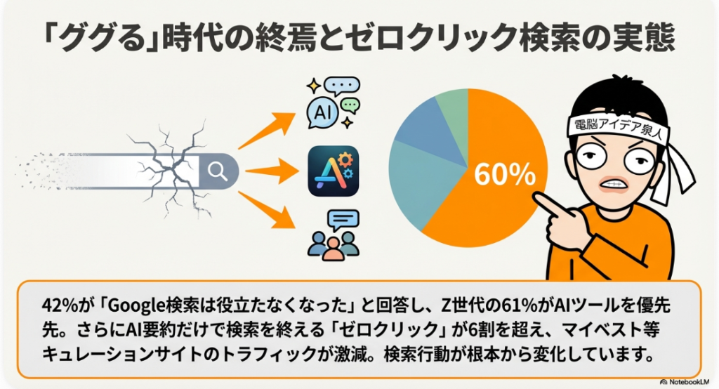「ゼロクリック検索」と呼ばれる現象が本格化しています。検索結果のAI要約だけを読んで、サイトにアクセスしないケースが6割を超えました。コンテンツクリエイターにとって大きな課題です。