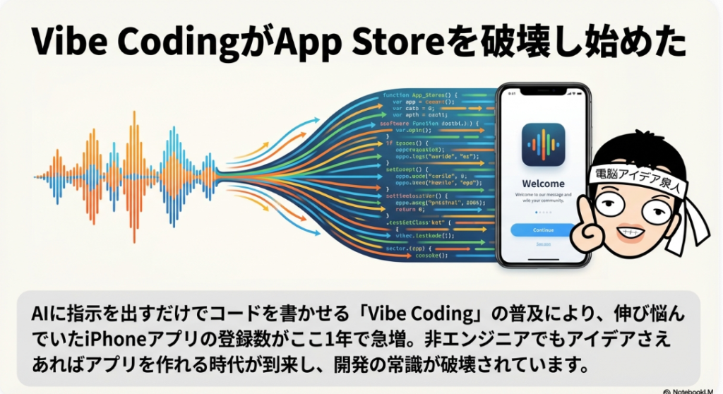 💻 Vibe Coding AIに自然言語で指示を出すだけでコードを自動生成させる開発手法。プログラミング知識がなくてもアプリ開発が可能になり、App Storeへの登録アプリ数が急増する一因となっている。エンジニアの役割やソフト開発の在り方そのものを変えつつあるパラダイムシフトといえる。