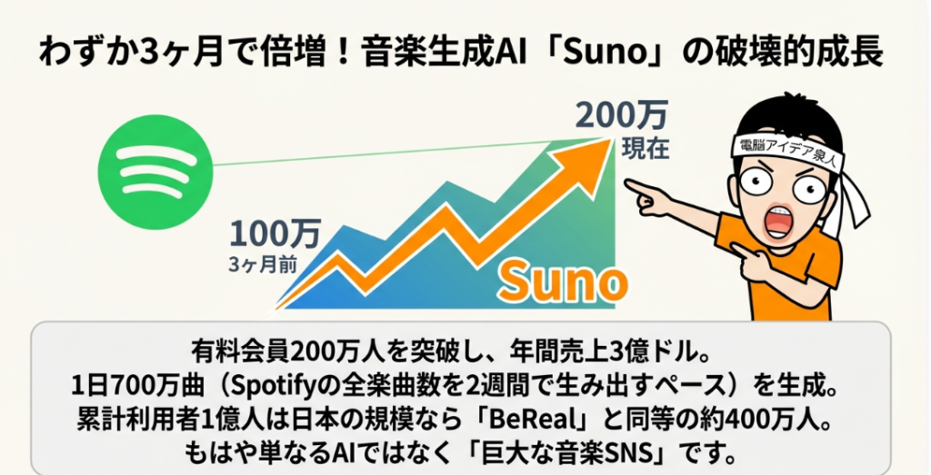 🎵 Suno 2023年にサービス開始した音楽生成AIプラットフォーム。わずか3ヶ月で有料会員が100万人から200万人に倍増し、累計利用者は1億人超。1日あたり700万曲を生成し、Spotifyの全楽曲数を2週間ごとに上回るペースで楽曲を生み出すという驚異的な成長を続けている。