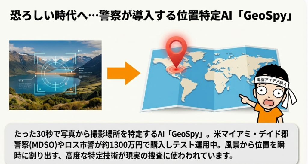 📍 GeoSpy 写真を解析して撮影場所を瞬時に特定するAIツール。警察が捜査活動に導入していることが明らかになり、盗難車の発見など実績も報告されている。高精度な位置特定能力は犯罪捜査の強力な武器となる一方、プライバシー侵害への懸念も高まっている。