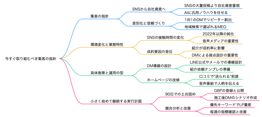 A: アンケート調査でも明らかになっているように、「知人の紹介」が最も効果的です。そのため、既存顧客との関係性を深め、自然に紹介が生まれる仕組みを作ることが最優先です。具体的には、Deep Mediaアプローチとして、LINE公式アカウントやInstagramのDMを活用した定期的なコミュニケーション、施工後のアフターフォロー、季節ごとのメンテナンス情報の提供などが有効です。また、口コミされやすいホームページの整備も重要です。紹介者がLINEやメールで簡単にリンクを送れるようなホームページを用意し、そこには施工事例、お客様の声、会社の雰囲気が分かる写真や動画を充実させることで、紹介からの成約率を高めることができます。さらに、MEO対策でGoogleビジネスプロフィールを最適化することも、地域での認知度向上に大きく貢献します。
