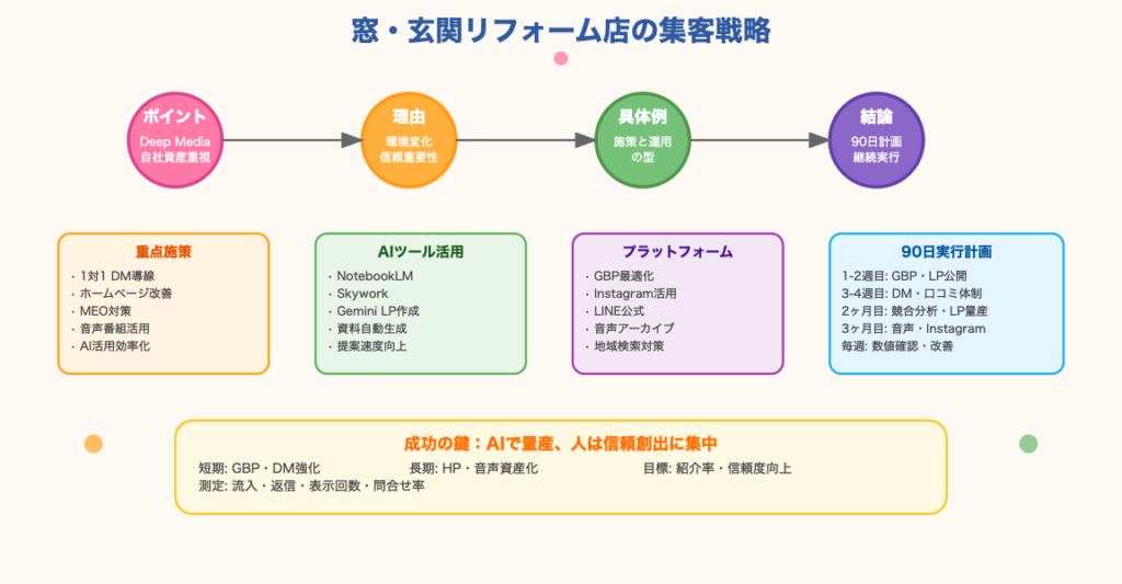 本日は、窓・玄関リフォーム店が今すぐやるべき集客・販促・Webマーケティングの13の切り口について、四国でのセミナー内容を基にお伝えしてきました。生成AIが当たり前になった今、スライド資料さえもAIが一瞬で作れる時代になりました。しかし、だからこそ人間が提供すべき価値、AIでは代替できない深い洞察や現場での実践知識の重要性が増しているのです。