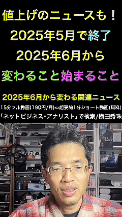 ネットビジネス・アナリスト横田秀珠による2025年6月の変化解説。楽天トラベルは6ヶ月連続マイナス。5月末終了:PlayStation Stars等。6月開始:ヤマト運輸こねこ便420円、刑法改正で懲役・禁錮が拘禁刑に一本化、熱中症対策義務化、iPhoneマイナンバーカード実装。6月終了:gooニュース・辞書、BIGLOBEニュース・サーチ・天気、画像生成AI mimic、Yahoo!ドメイン、FC2WEB、チケトレ、LINEドクター、ドコモ絵文字等多数サービス終了で大きな変化の月。
