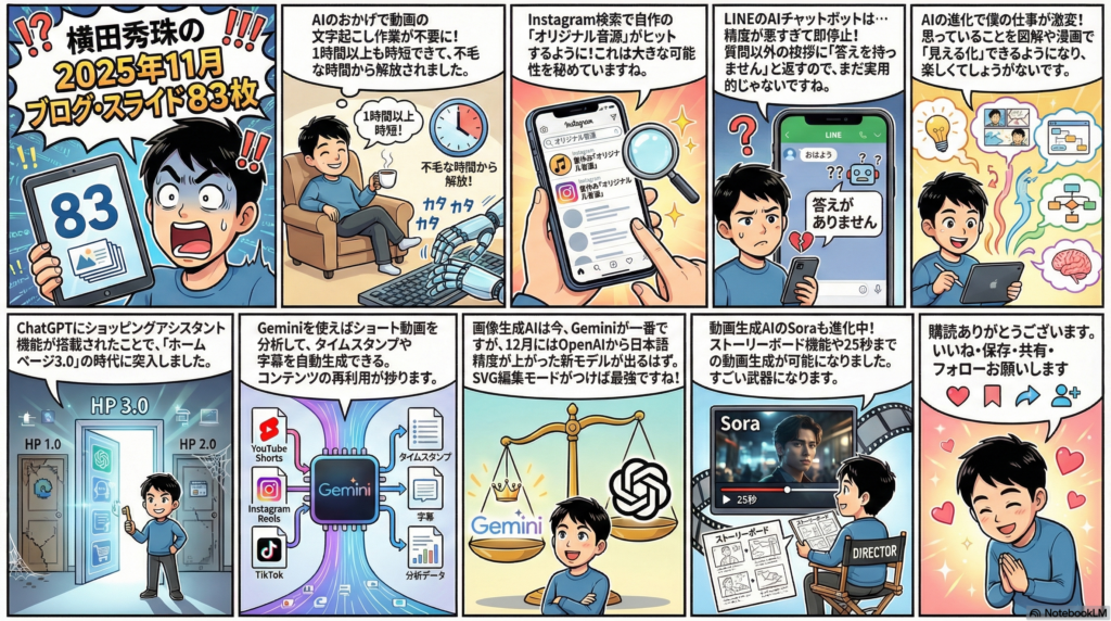 AI活用による作業効率化が大きく進展!字幕入力の廃止で1時間以上の時間短縮を実現。 ChatGPT・Claude・Geminiの連携活用で、ブログ・スライド・インフォグラフィック作成が劇的に改善。 「図解ができるようになりたい」という昨年の目標が、今やAIで漫画まで作成可能に進化!