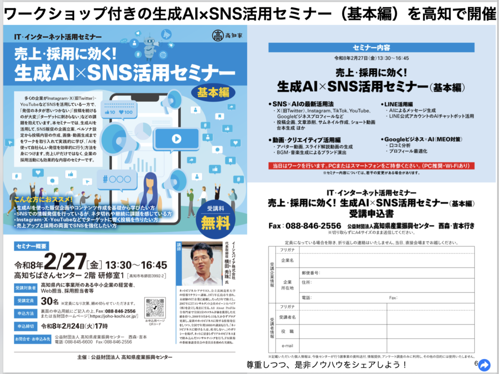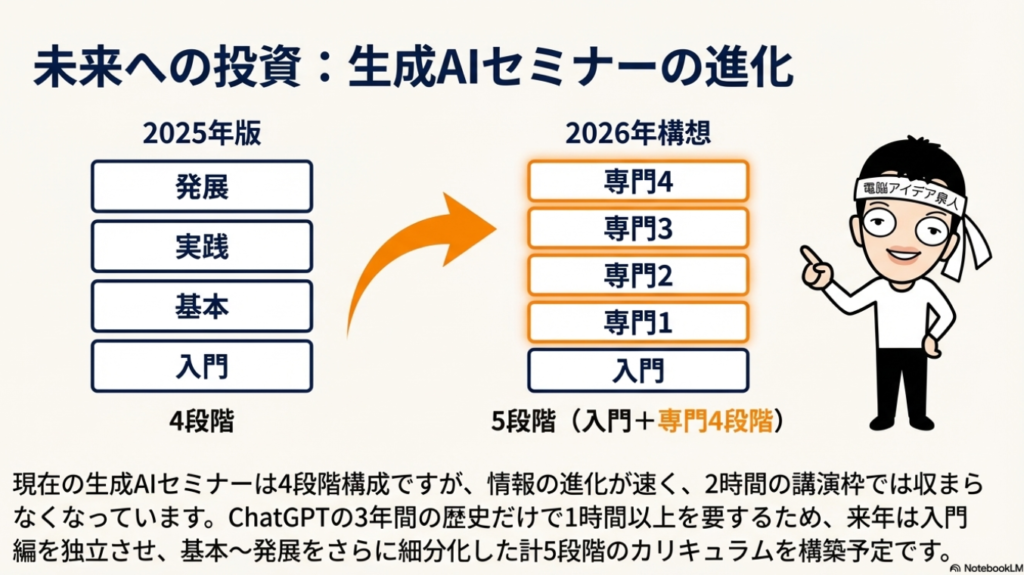 来年に向けては、生成AIセミナーのカリキュラムを5段階構成に拡充することを計画しています。ChatGPTが登場してから3年が経ち、説明すべき内容も大幅に増えました。また、Microsoft Copilotを活用した業務研修や、SNS別の生成AI活用セミナーなど、新しいコンテンツの開発にも取り組んでいく予定です。
