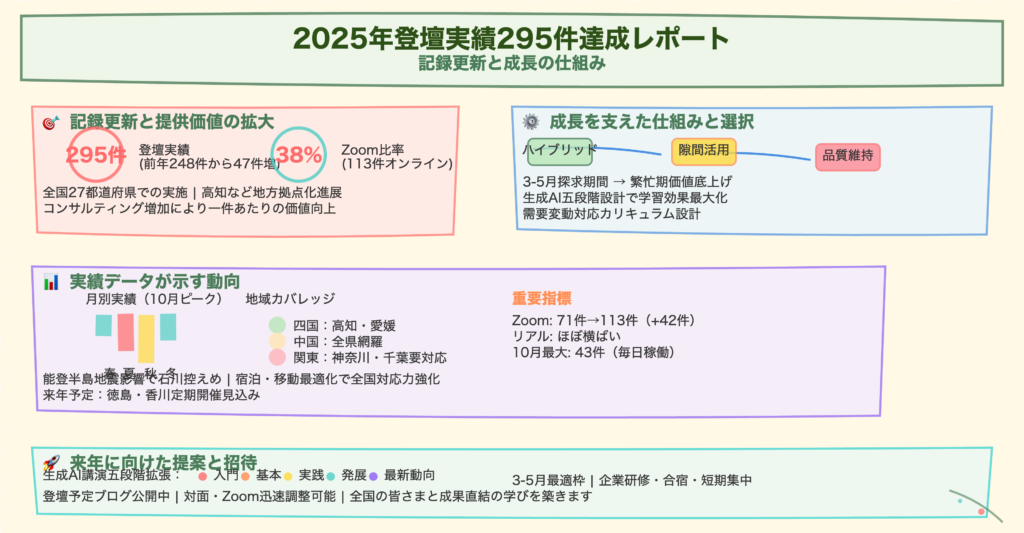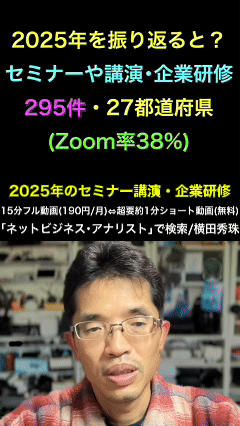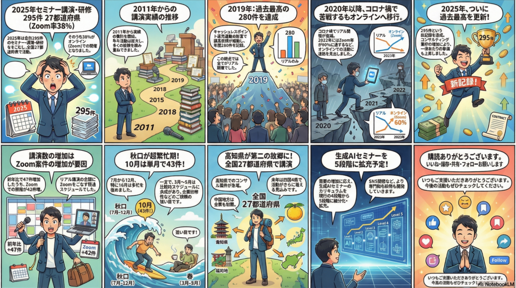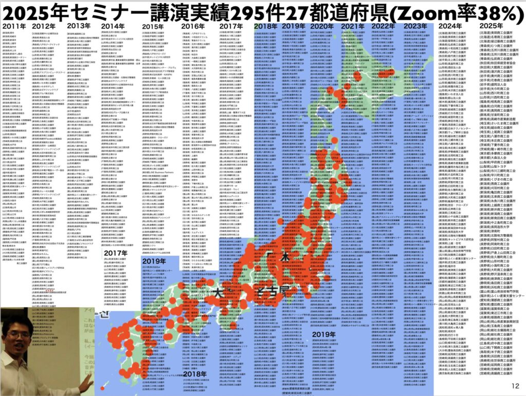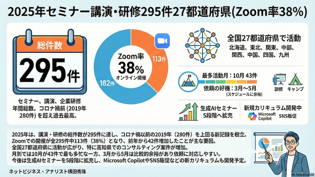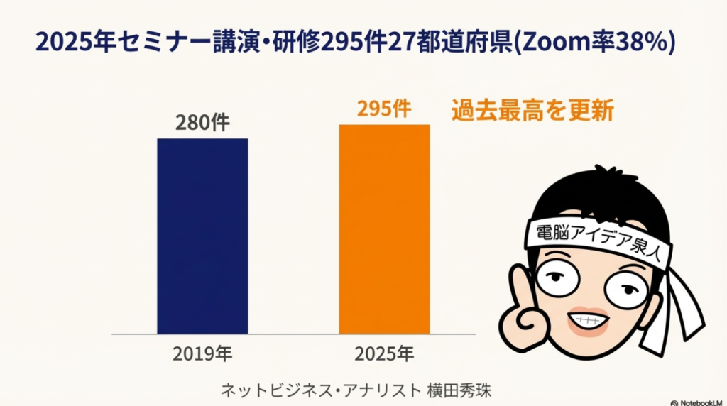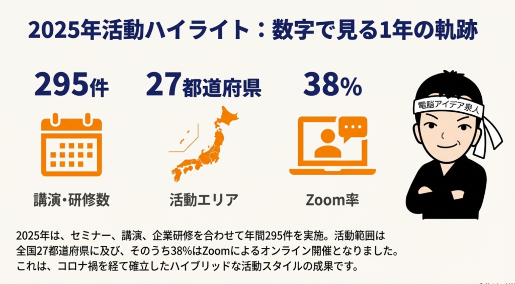 恒例企画、今回こちらになります。2025年を振り返ると、セミナーや講演、企業研修295件、27都道府県、そしてZoom率38%ということでお話をしていきたいと思います。