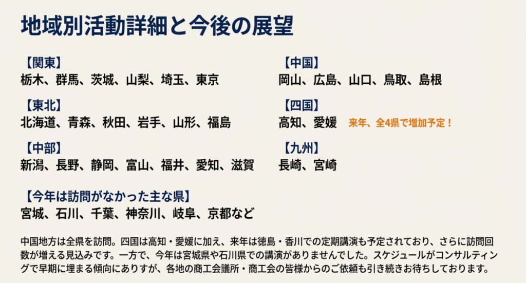 四国の方があれ、四国どこ行った?四国がそうか、四国は講演していない県ないんだけどな。ちょっとこれ漏れているな。そうか、主催者の分で漏れているんだけど、高知とあと愛媛は行っているんですけど、ここが来年増えそうですね。予定では徳島と香川の方はちょっと定期的な講演が入りそうなので、四国はまた行く回数増えそうですね。愛媛もそうですね。増えるので四国はこの4県とも増えるんじゃないかなと思います。香川、徳島、高知、愛媛ですね。