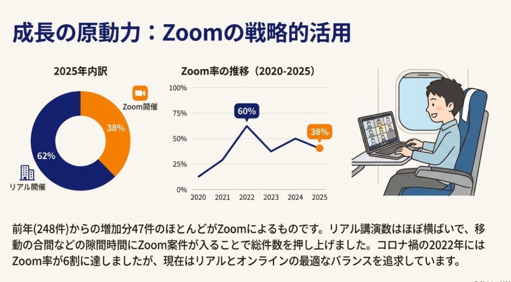 今年の特徴として、Zoom率が38%に上昇したことが挙げられます。リアル講演の回数はほぼ横ばいでしたが、その隙間時間にZoom講演を入れることで、全体の件数を大幅に増やすことができました。一方で、7月から12月にかけては毎日のように講演が入り、ブログ執筆や動画制作と並行しながらの活動は、正直なところ体力的にも精神的にも大変な日々でした。