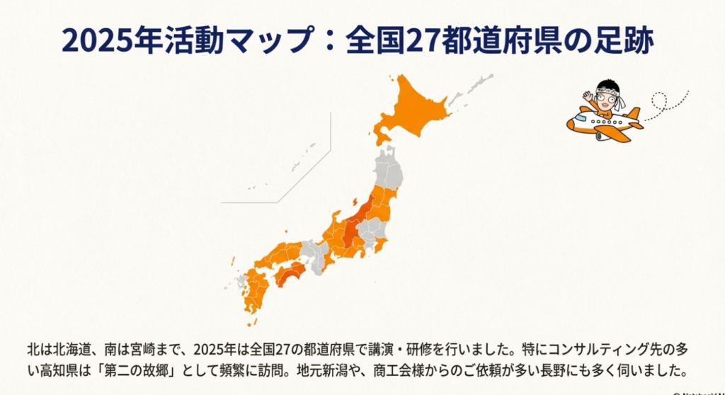 A4. はい、全国どの地域でも対応可能です。今年は27都道府県で講演を行いました。特に高知県はコンサルティングのお客様が増えたことで、第2の故郷のように頻繁に訪問しています。来年は四国4県(香川・徳島・高知・愛媛)での講演が増える見込みです。遠方の場合はZoom講演という選択肢もありますので、まずはお気軽にご相談ください。