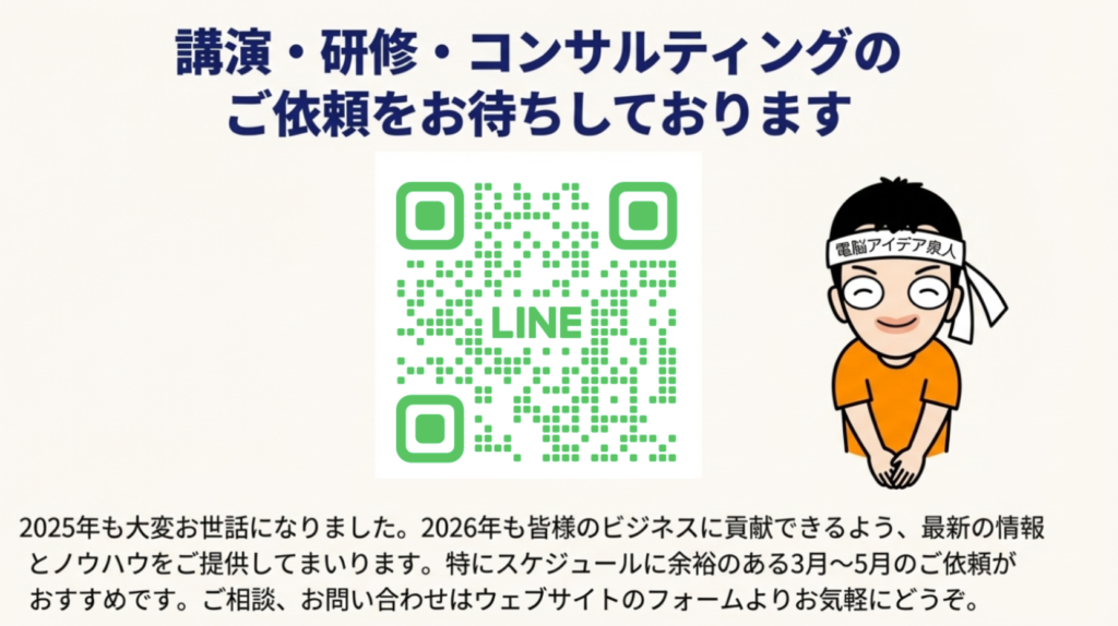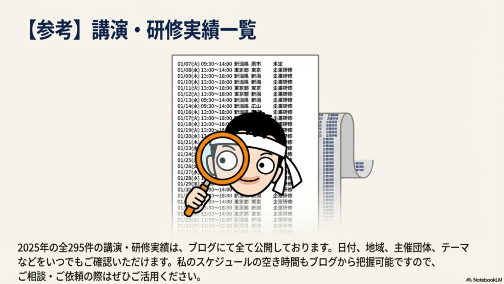 2025年の講演活動を振り返ってきましたが、いかがでしたでしょうか。今年は295件という過去最高の講演実績を達成することができました。これはひとえに、講演やセミナーにお声がけいただいた皆様、そして参加してくださった受講者の皆様のおかげです。心より感謝申し上げます。