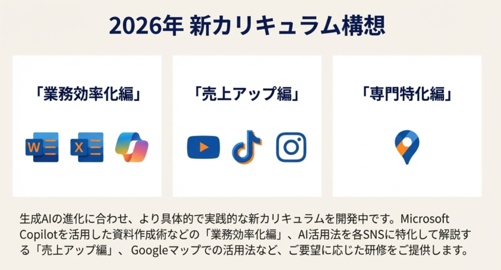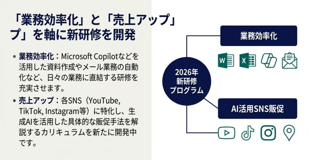 業務研修系の方が実はあんまりこう内容がこう煮詰まっていなくて、いわゆるその資料作成とか、メールを使った何かとか、こういった部分のいわゆるこのWordとかExcelとかみたいなMicrosoftのCopilotの話とか、こういった分の研修もこれから充実させていきたいなと思っているし、売上アップ編の方も今SNS中心に色々やっているんですけど、ここもかなり多岐にできるようになったので、それぞれのSNSごとに絞ってやっていってもいいのかなと思っているんですね。