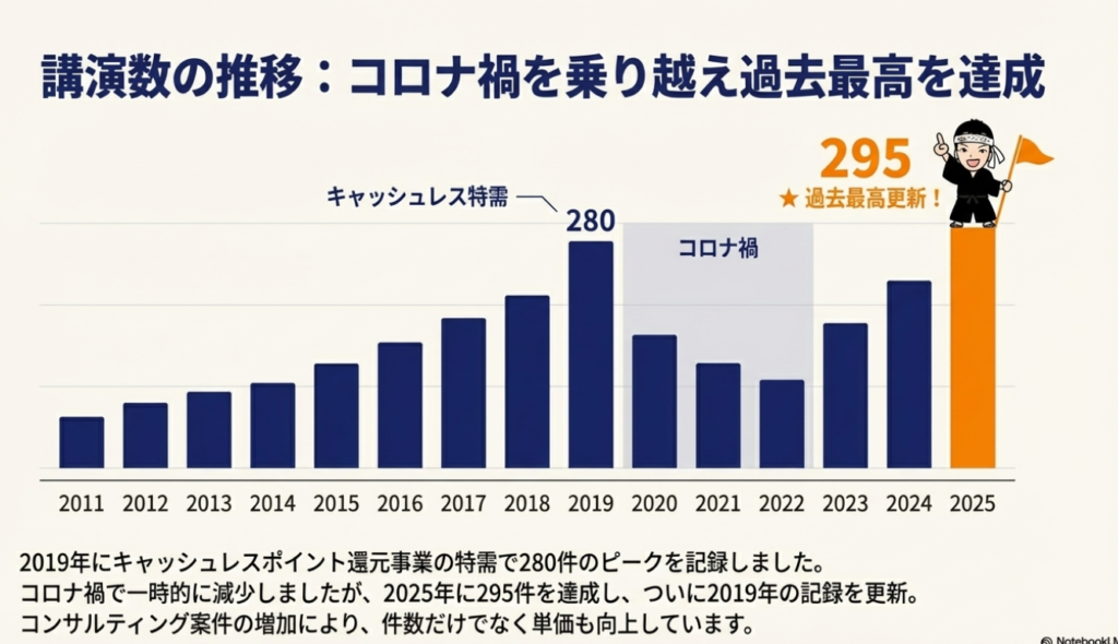 これでコロナ前に達成したこの2019年の280件という講演実績を初めて、今年2025年に295件ということで抜くことができたんですね。ただ、2019年の時は全部リアル開催なんですよ。ですけど、2025年はZoomのオンラインが結構増えているので、移動距離の面では2019年には勝てていないと思うんですけど、ただ2025年は回数ではもちろん多かったですし、あとは単価が上がっているんですね。というのはコンサルティングが増えているので、その一件あたりの単価が上がっているというのもあります。おかげさまでこういう数字になりました。ありがとうございます。
