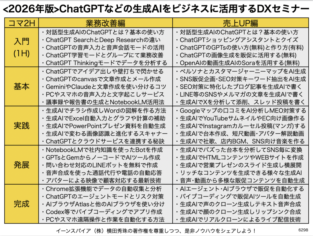 ◦ 内容: 「生成AIとは何か」、ChatGPTの3年間にわたる進化の歴史、主要AIツールの概要、ビジネス活用の全体像など。